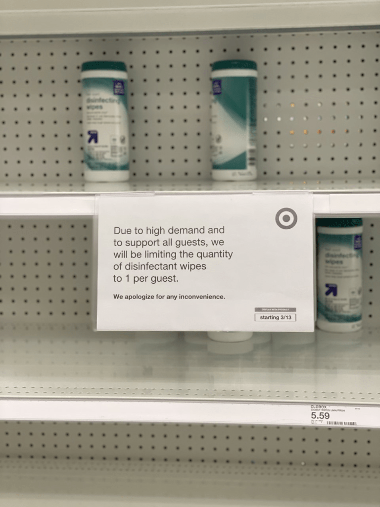 Most of the pictures I took were just of the aisles, products or signs telling people how many of a product they could purchase. The signs are a big thing in stores now, most stores limit guests to 1-3 of the same sanitizing or disinfecting items. Most of the things that were in the stores I went to find the best visual of missing essentials were sold out. While working at these stores, every day we get asked “do you all have Lysol? Are there any Lysol wipes…” The answer has been “no” very often.