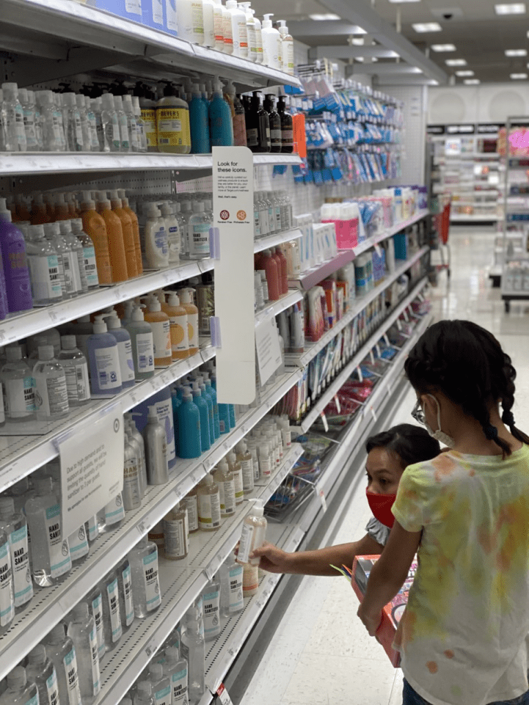 The picture I took of the mother and daughter in the hand sanitizer aisle was interesting, because as soon as I walked up, she said “oh let’s try this one.” It is kind of strange now that I think about it because there are so many different types of sanitizer that we didn’t have before. Like the hair/body company “Sauvé” now has their own kind now. It is just an odd thing because I think of how it was only a couple different brands, the most used is “GERM-X,” now there are about 5-10 brands to choose from.
